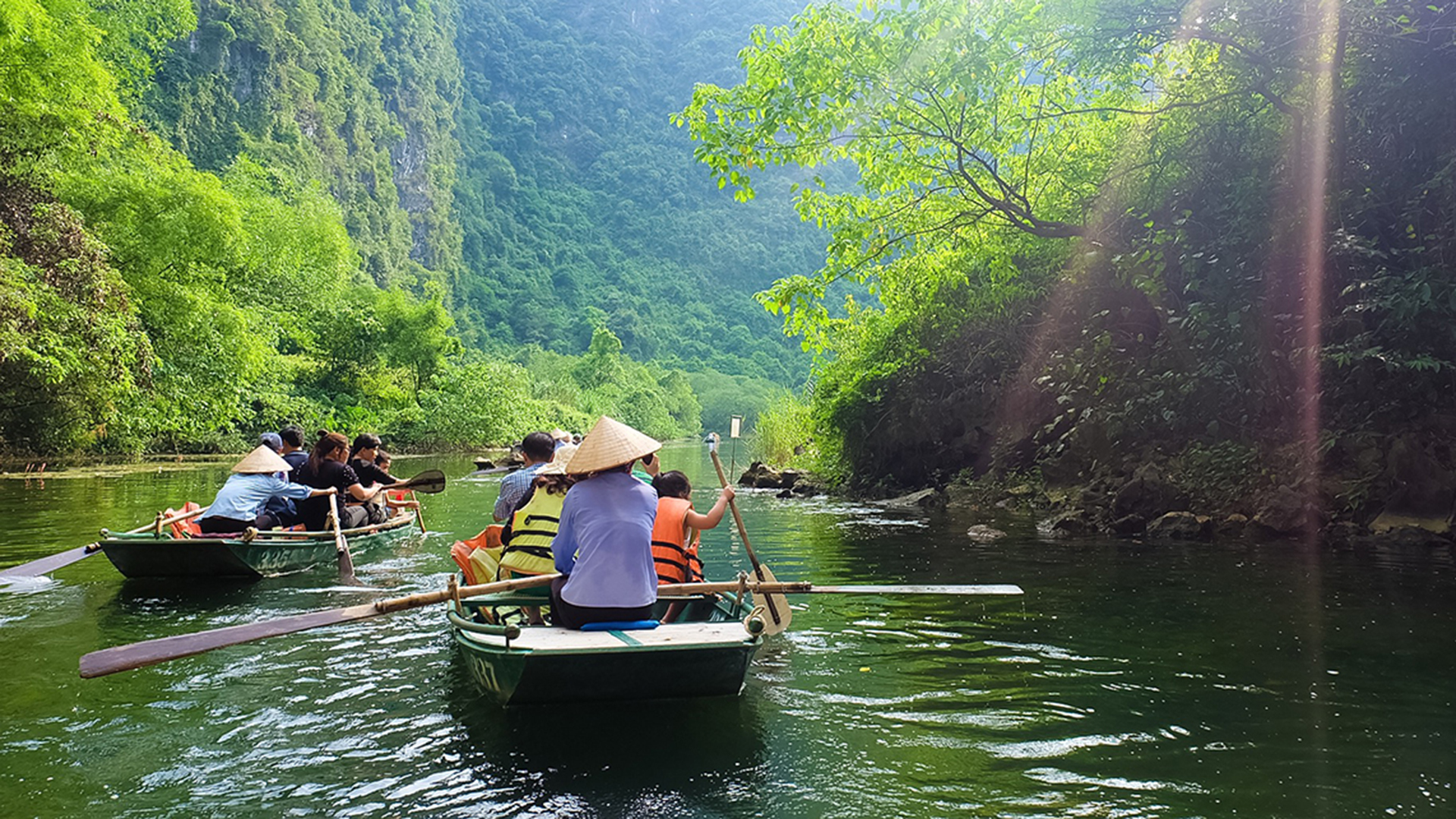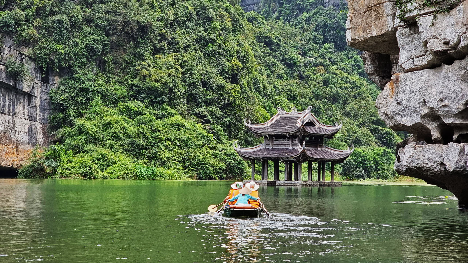 Continue to Trang An Grottoes, a UNESCO World Heritage Site known for its emerald waters and dramatic karst mountains.