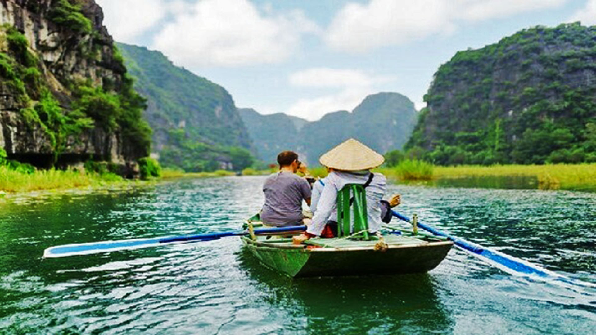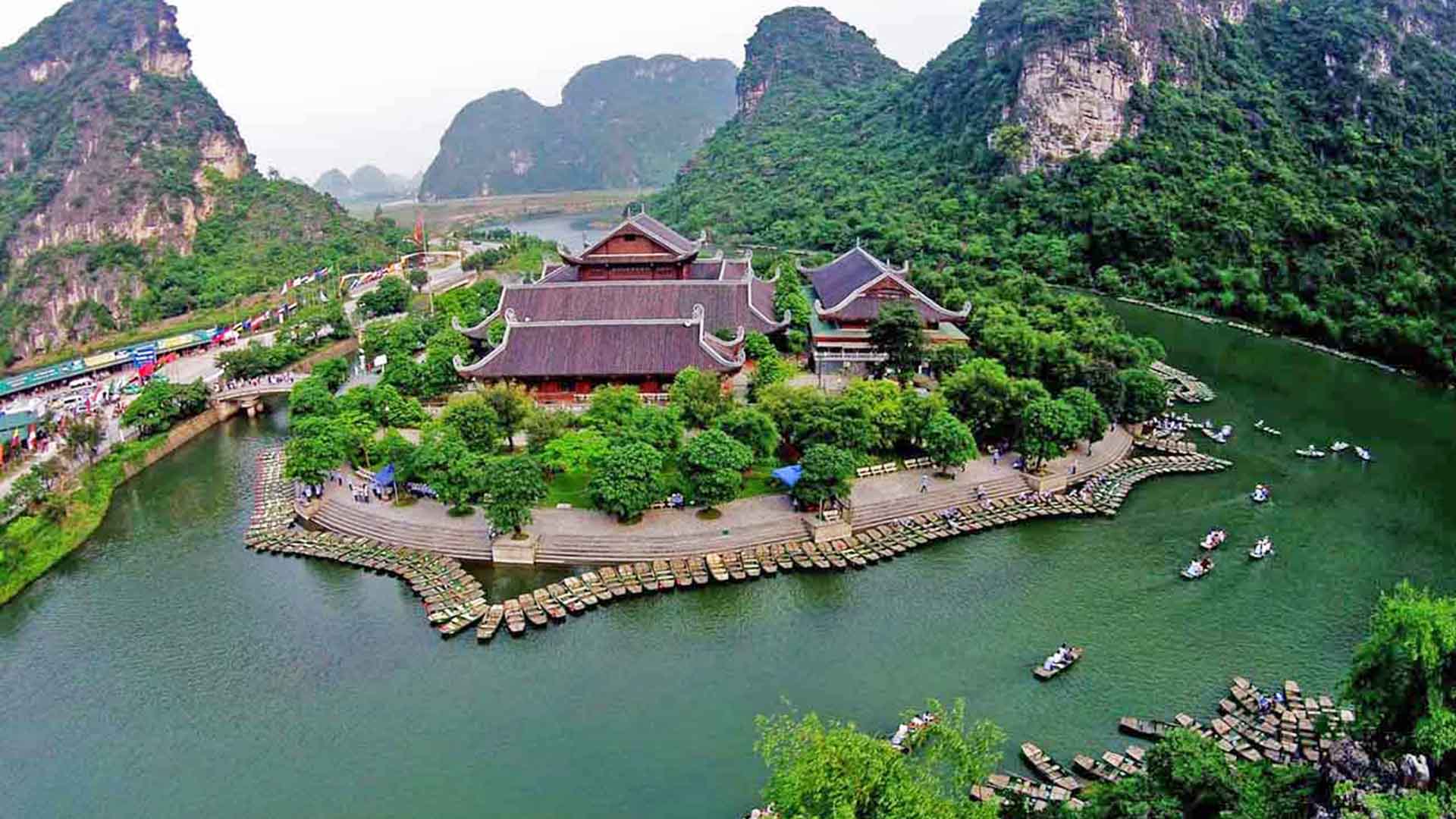 Continue to Trang An, a UNESCO World Heritage Site known for its emerald rivers and stunning limestone karst formations.